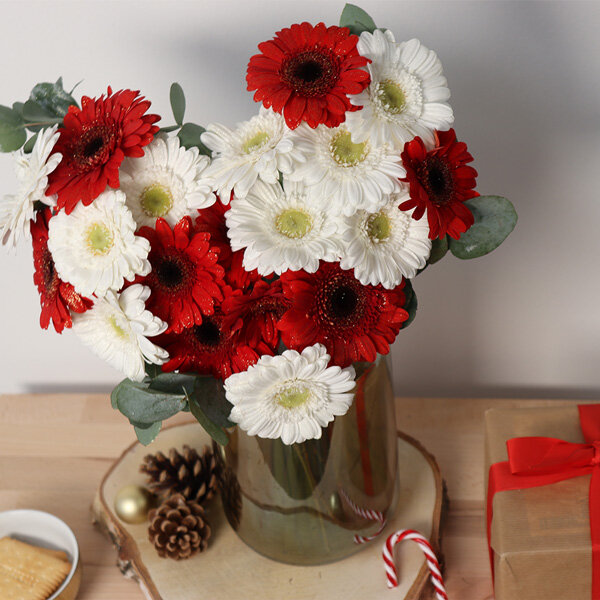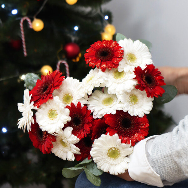 Vous cherchez le cadeau idéal ? Laissez-vous séduire par ce somptueux bouquet en cœur composé de germinis pailletés. Confectionné pour les amoureux de Noël, il arbore de délicates teintes de rouge et de blanc, symbolisant un amour pur et sincère, il s’harmonisera parfaitement à la saison des fêtes. N’hésitez plus et offrez un bouquet Florajet pour célébrer la magie de cette saison !