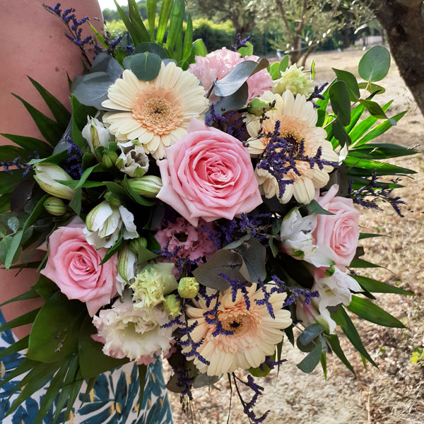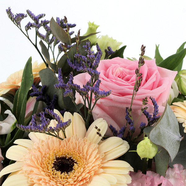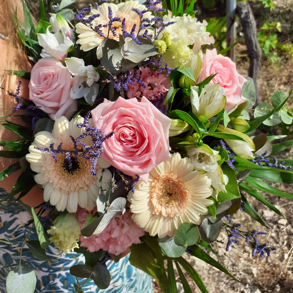 Bouquet dans les tons pastel composé de roses, germinis et fleurs de saison.