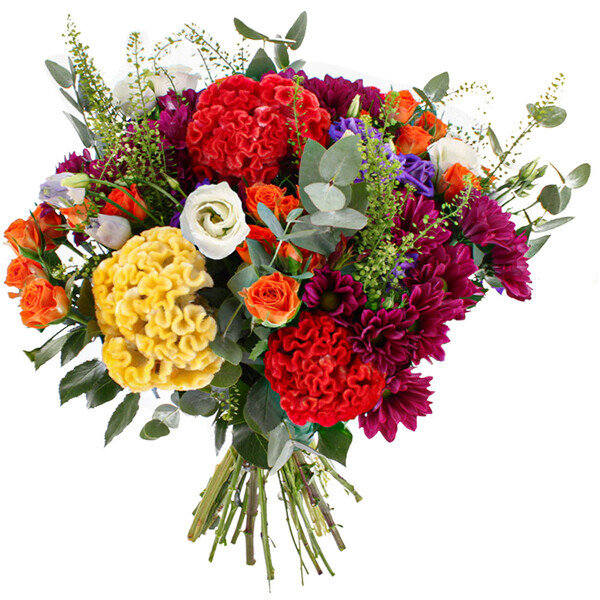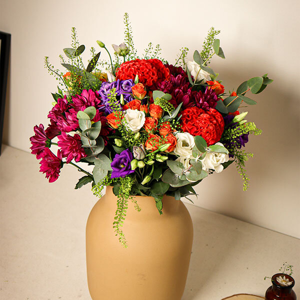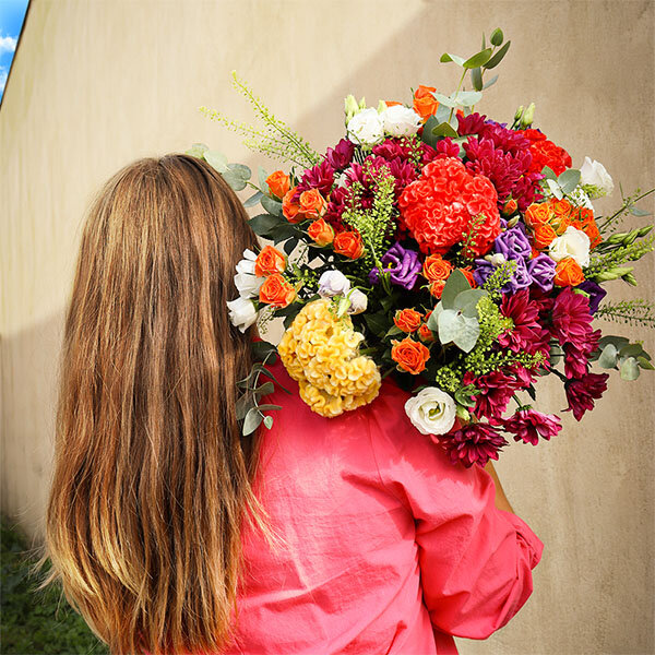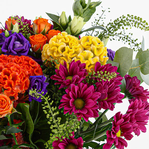 Plongez dans l'ambiance ensoleillée de la saison avec Color Pop XL, la version grand format de notre bouquet emblématique. Plus généreux, plus spectaculaire, il rassemble les mêmes variétés hautes en couleur : lisianthus, roses spray, chrysanthèmes et celosias cristata, le tout agrémenté d'eucalyptus et de thlaspi, dans une composition encore plus audacieuse. Véritable festival floral, il insuffle une énergie positive à votre intérieur et fait sensation en cadeau. Offrez une vague de fraîcheur et de gaieté, livrée en 24 h grâce au savoir-faire de Florajet.