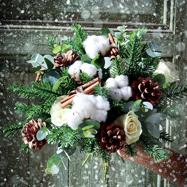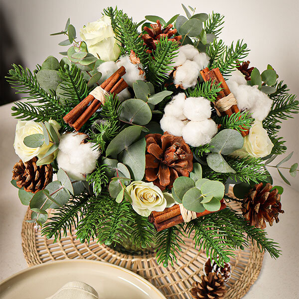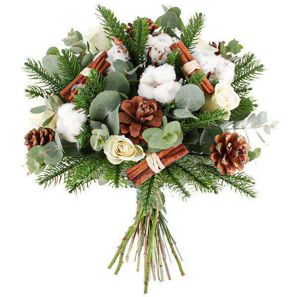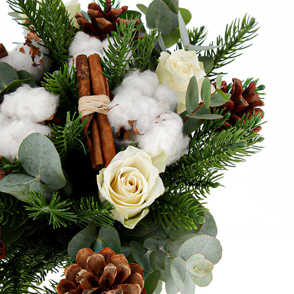 Bouquet blanc et vert, composé de roses, fleurs de coton, branches de sapin et décoration de Noël.