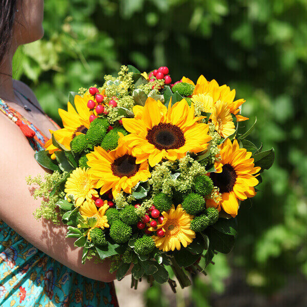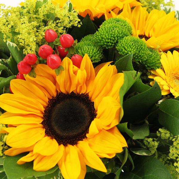 Bouquet rond dans les tons jaune et vert avec de généreux tournesols et germinis.