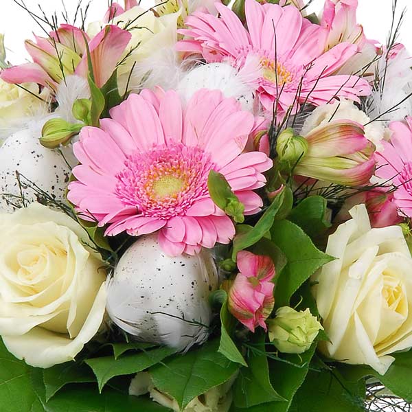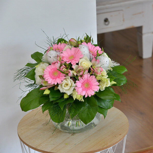 Bouquet rond dans les tons rose et blanc composé de germinis roses, lisianthus, divers feuillages et décorations de Pâques.