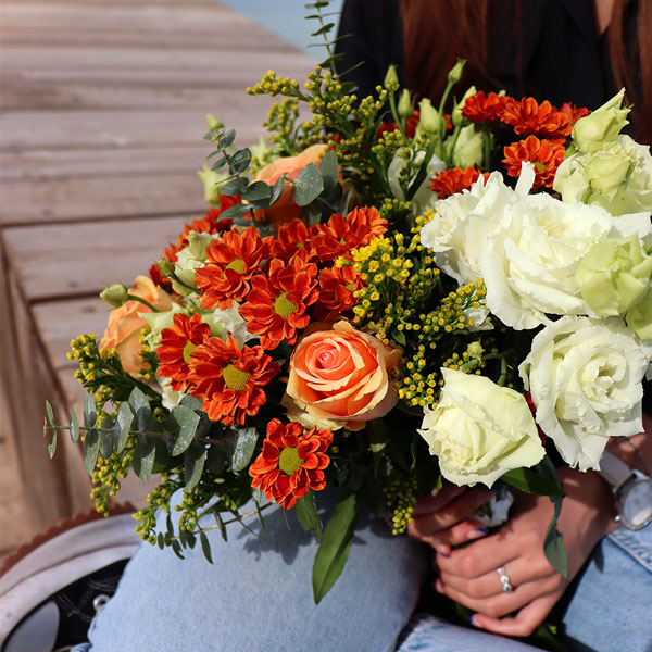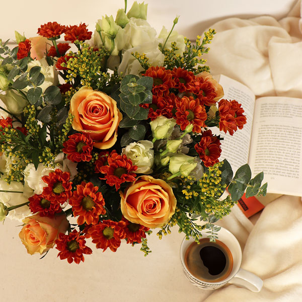 Le bouquet Douceur d'Automne, avec ses nuances chaleureuses d'orange, de blanc et de vert, enveloppe votre intérieur de sérénité. Les roses apportent une touche de tendresse, tandis que les lisianthus et l’eucalyptus ajoutent une note de fraîcheur et de légèreté. Harmonieusement composé, il évoque la quiétude d’un cocon automnal. Succombez à son charme et faites-vous livrer dès aujourd’hui pour célébrer l’automne en beauté, en apportant à votre intérieur une décoration à la fois douce et apaisante.
