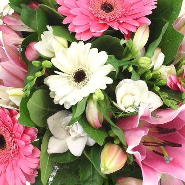 Bouquet rond dans les tons rose et blanc, composé de gerberas, lys, roses, fleurettes et feuillage.