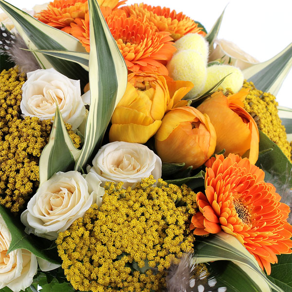 Gerberas, roses et renoncules s'entrelacent à de délicates décorations de Pâques pour former un bouquet éclatant. Ses nuances de jaune, d’orange et de crème insufflent la vitalité du printemps dans votre intérieur, pour une déco de Pâques pleine de charme.