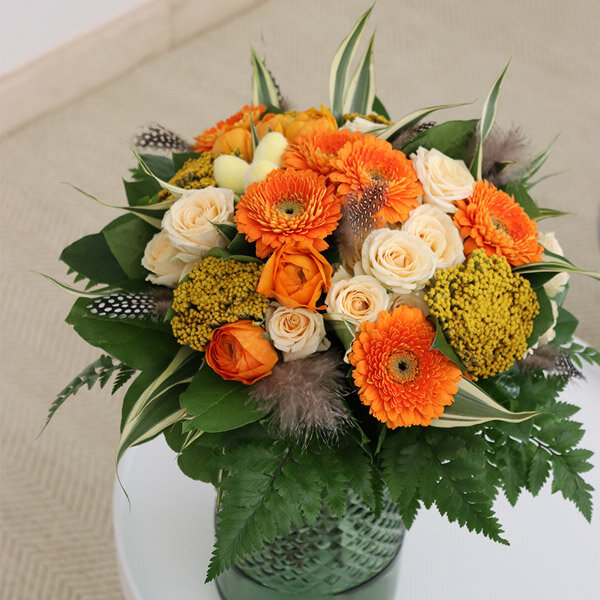 Bouquet de Pâques dans les tons orange et crème, composé de roses, gerberas, fleurs de saison et décorations de Pâques.