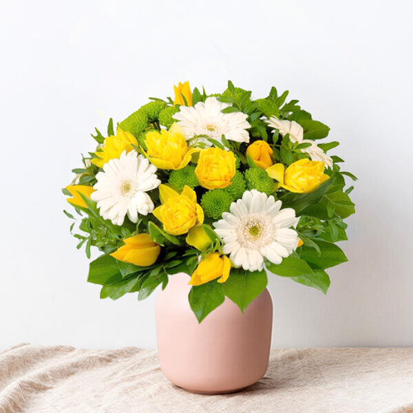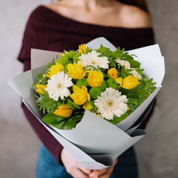 Bouquet rond dans les tons jaune et blanc composé de tulipes, jonquilles, germinis, santinis et finalisé par une collerette de feuillage.