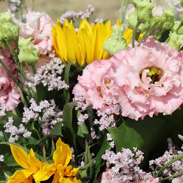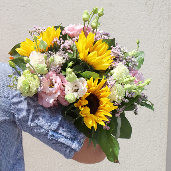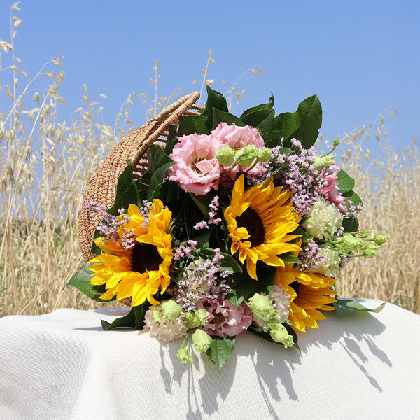 Afin de mettre à l’honneur la fleur du soleil, le tournesol, ils l’ont harmonieusement accompagnée de lisianthus et de roses aux teintes douces. Ces fleurs délicates laissent toute la place aux couleurs chaudes et vibrantes qui composent le cœur de ce bouquet lumineux.