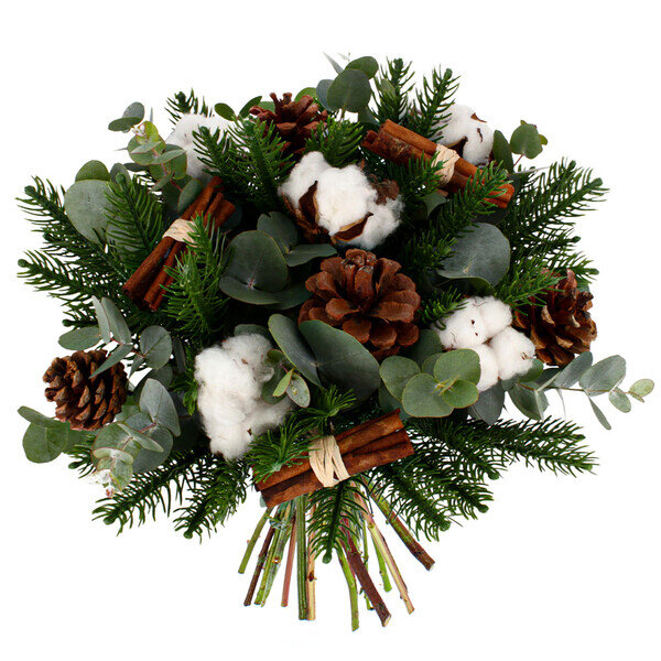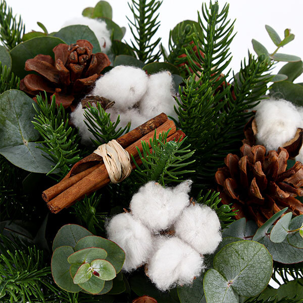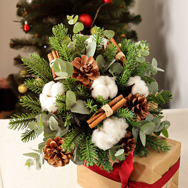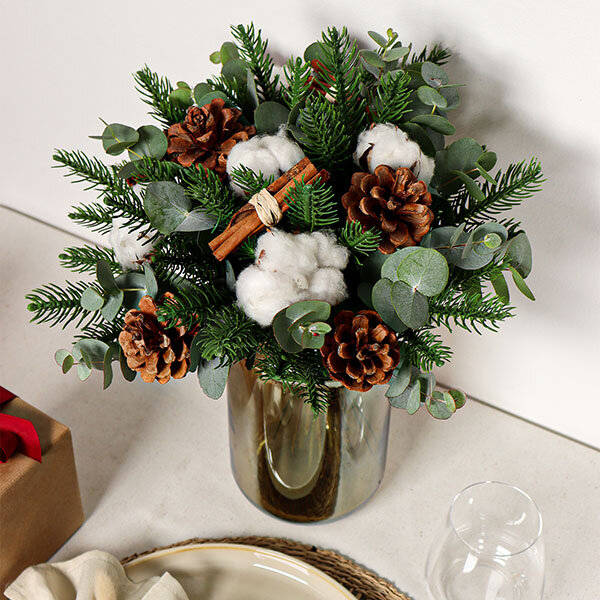 Le parfum du sapin se mêle aux notes épicées de la cannelle, pendant que les pompons de coton rappellent les flocons qui tombent. Un bouquet qui attire le regard et réchauffe l'atmosphère, que ce soit sur votre console d'entrée ou au centre de la table de la cuisine.