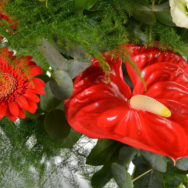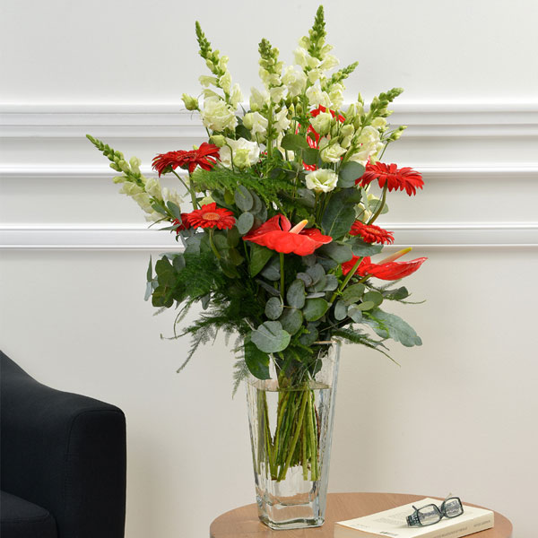 Bouquet longues tiges dans les tons rouge, vert et blanc composé de lisianthus, anthurium, germinis, delphinium (selon disponibilité chez le fleuriste) eucalyptus et feuillages.