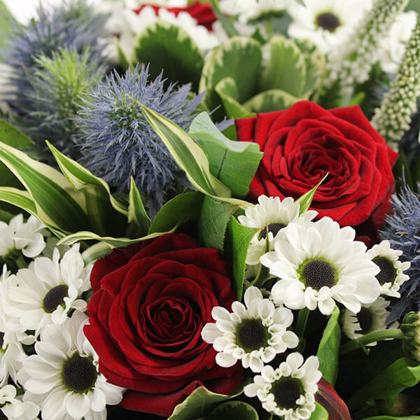 Bouquet rond dans les tons blanc, rouge et vert composé de roses, oeillets, chardons, fleurettes et feuillages.
