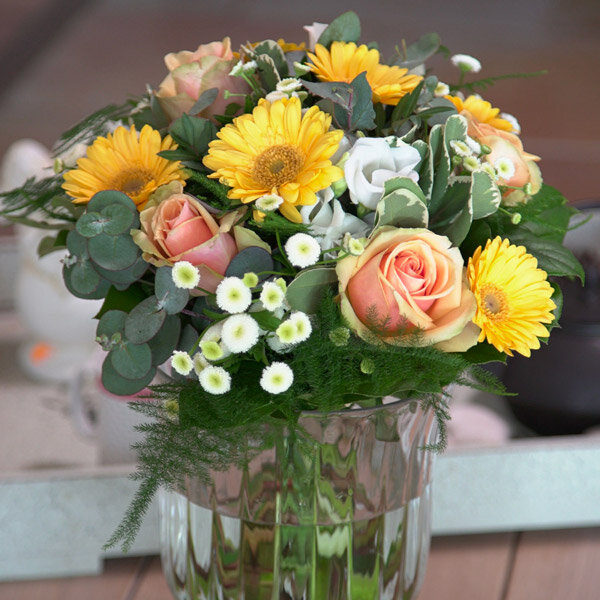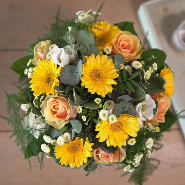 Bouquet dans les tons jaune, blanc et orange composé de roses, germinis jaunes, fleurs de saison et accompagné de feuillage.