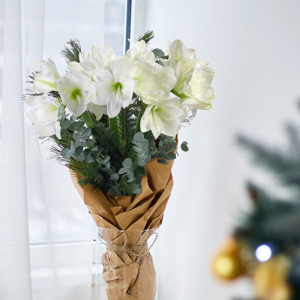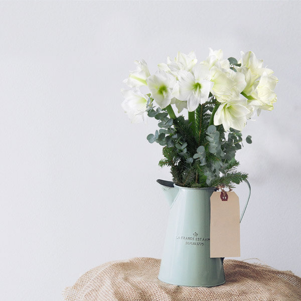 La somptueuse amaryllis se colore d'un blanc immaculé et s'accompagne d'un vert d'eucalyptus qui viendra éclairé la star florale de la saison. Pour habiller votre intérieur en cette période hivernale, décorer votre table de réception ou encore faire plaisir avec des fleurs avec notre bouquet Himalaya.