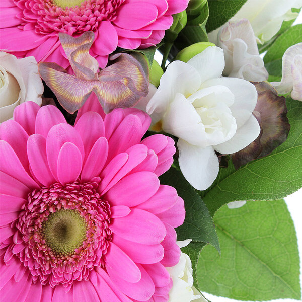 Parfaite symbiose de blanc immaculé, de rose dynamique et de violet profond, ce vibrant bouquet nous parle plénitude, douceur de vivre et profondeur des sentiments, idéal pour la fête des mères. Nous adorons les majestueuses roses blanches qui lient avec bonheur tous les ingrédients de cette jolie composition, une véritable apothéose des fleurs de la fête des mères. Bouquet tendre et profond à offrir sincèrement à votre maman pour sa fête !