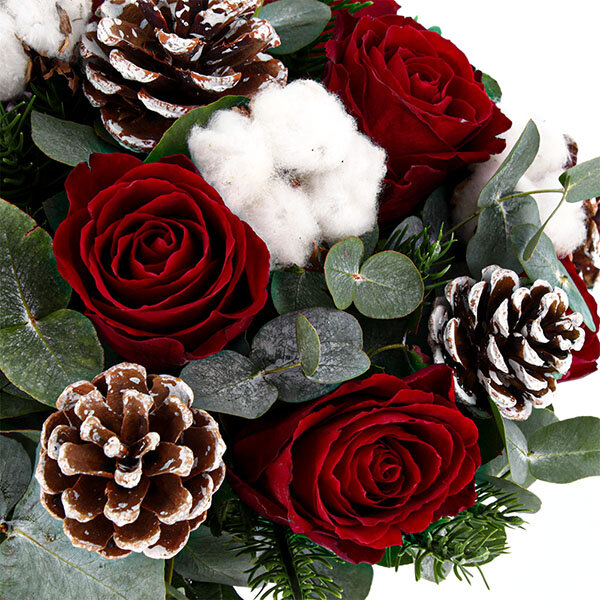 Le bouquet Jardin d'Hiver, c'est un peu de magie de Noël dans un vase. Avec ses roses rouges veloutées, ses branches de sapin qui sentent la forêt et ses fleurs de coton toutes douces, il capture exactement cette atmosphère des soirs de réveillon où tout le monde se retrouve.