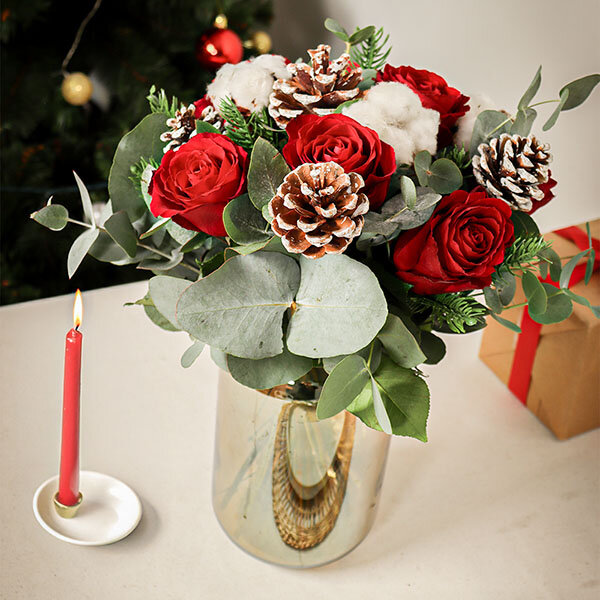 Les petites décorations de Noël glissées dans le bouquet lui donnent ce côté festif qu'on attend pour les fêtes. Sur votre table ou chez un proche que vous ne verrez pas ce 25 décembre, il apporte ce réconfort particulier de l'hiver, celui des lumières tamisées et des rires partagés.