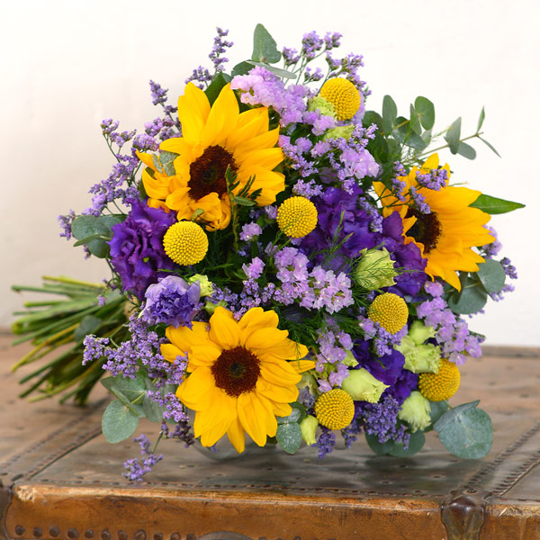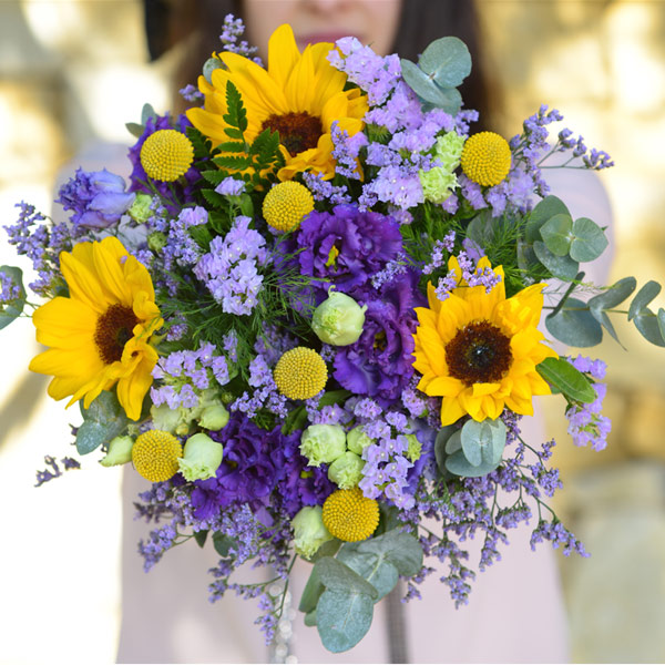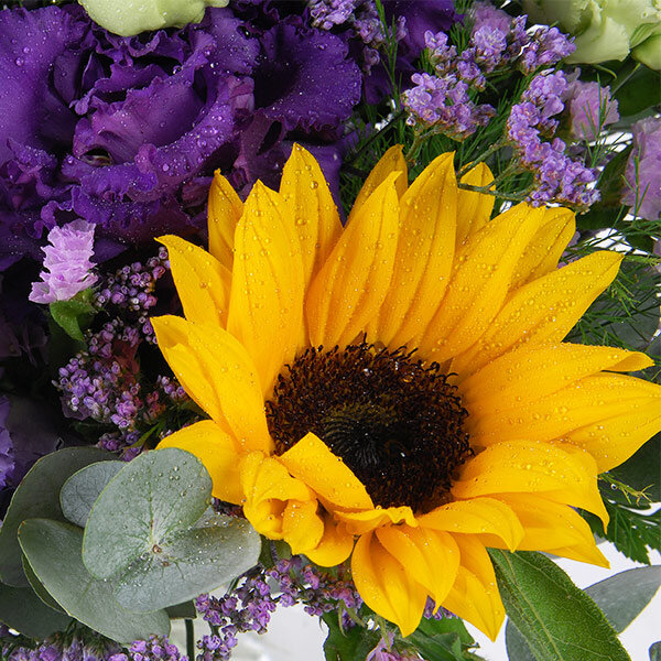 Bouquet dans les tons violets et jaunes composé de tournesols, lisianthus, limonium, fleurettes et feuillage.