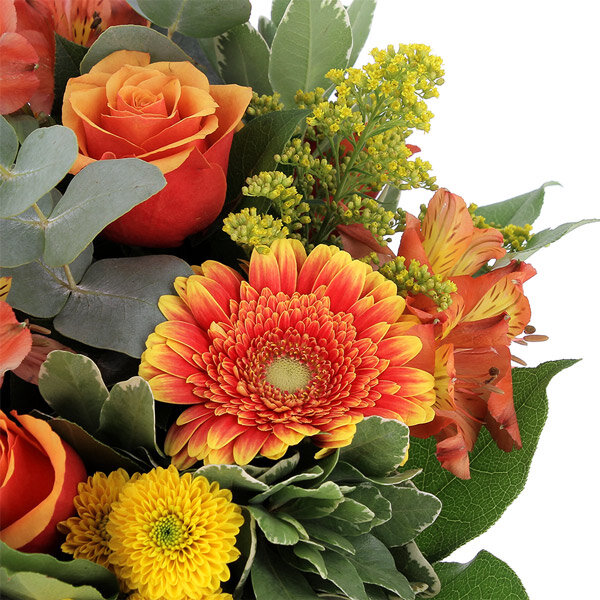 Bouquet dans les tons orange et jaune composé de roses, germinis et autres fleurs de saison.