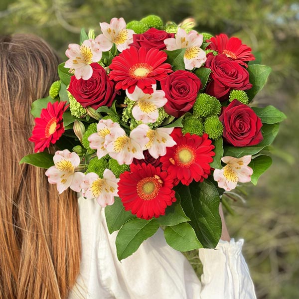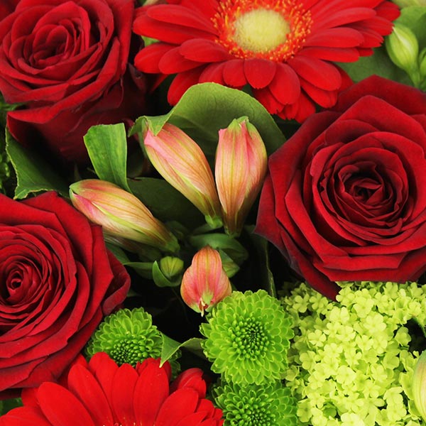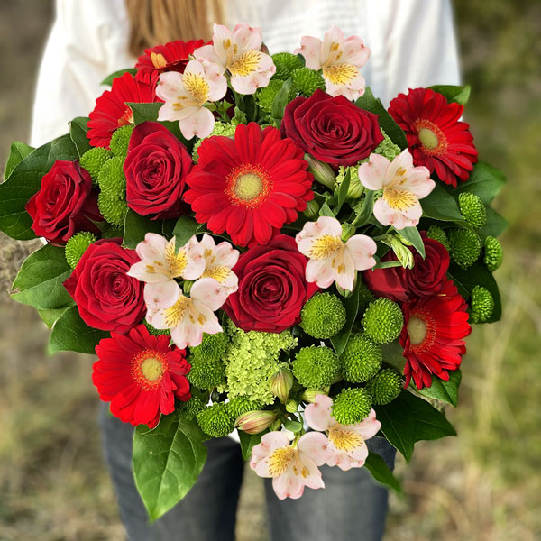 Bouquet rond dans les tons rouge, rose pâle et vert composé de roses, alstromérias, germinis et feuillages.
