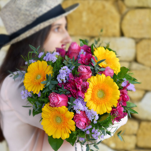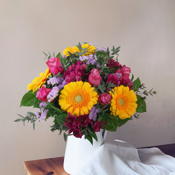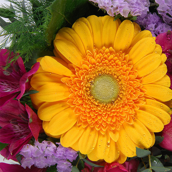 Venez découvrir en exclusivité notre nouvelle invité de marque, notre bouquet Mademoiselle. Gerberas, roses et alstromérias se sont rencontrés au sein de cette magnifique brassée pour vous offrir une balade colorée de jaune de rose et de violet. Une création unique à découvrir toute l'année pour toutes les occasions à travers la livraison fleurs !