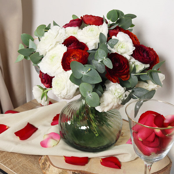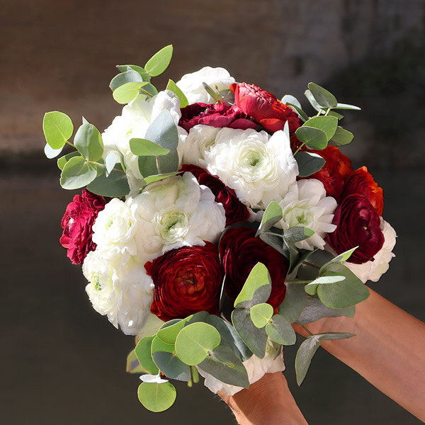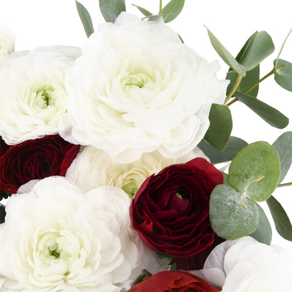 Bouquet blanc et rouge, composé de renoncules et de feuillages.