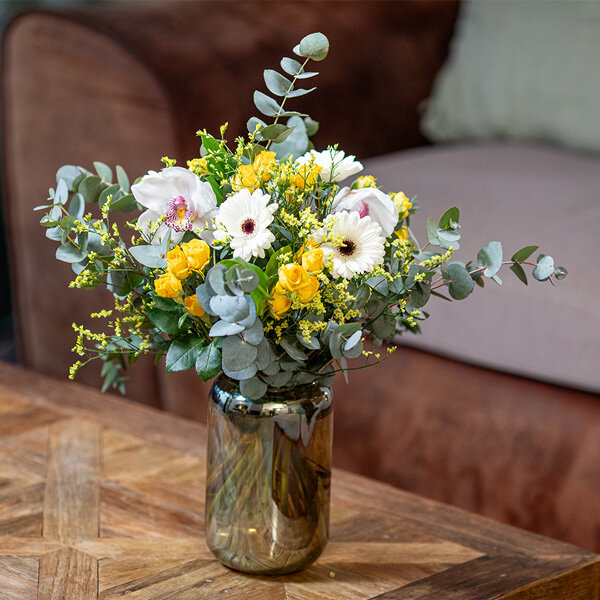 Bouquet dans les tons jaunes et écru composé de roses, germinis, orchidées et fleurs de saison.