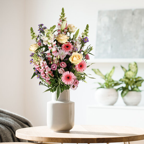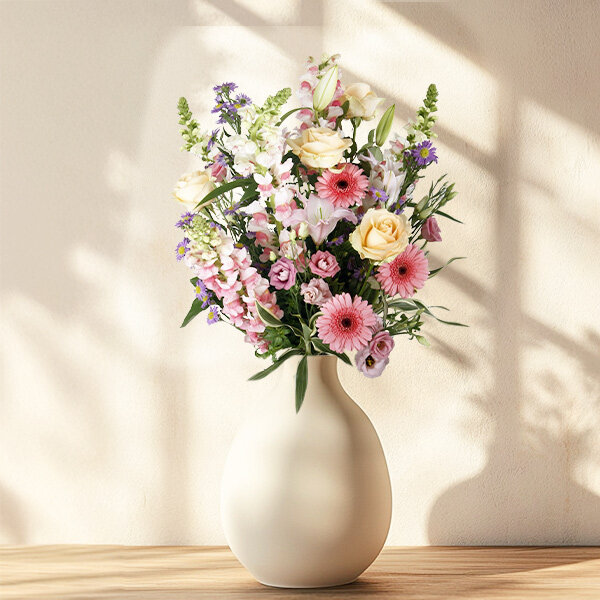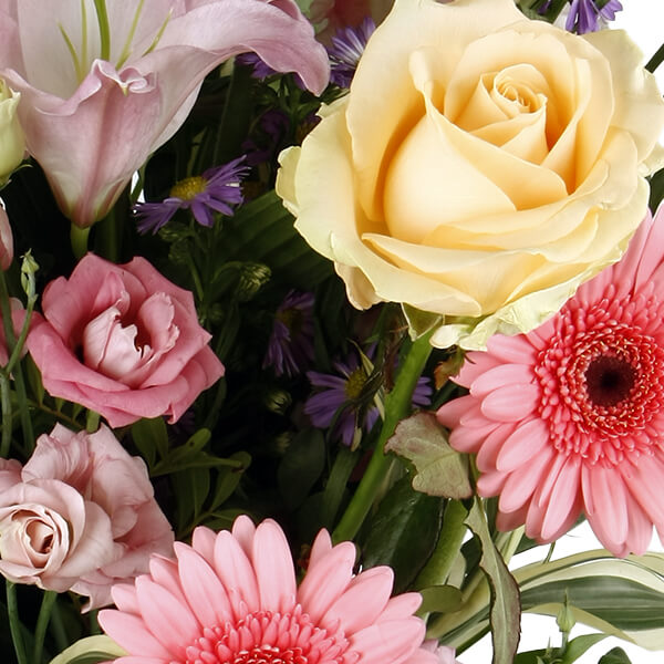 Bouquet longues tiges dans les tons rose pâle, crème et violet composé de roses, germinis, lys, lisianthus, muflier (selon disponibilité chez le fleuriste) et feuillages.