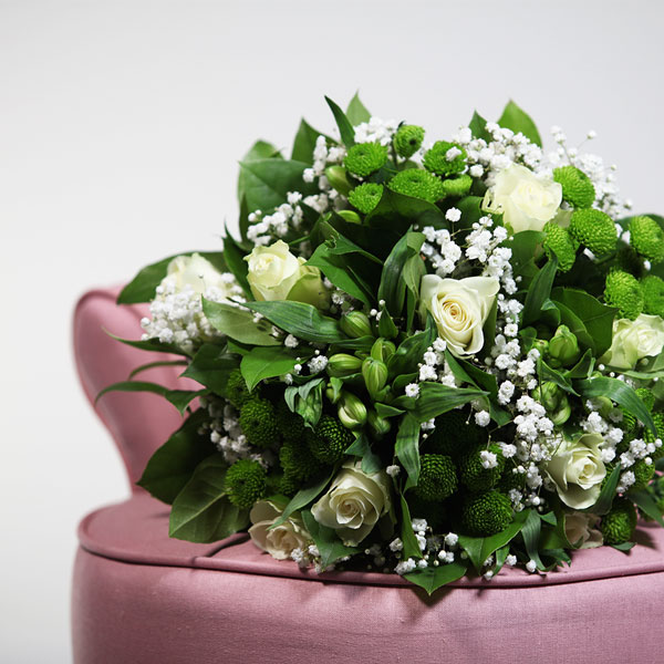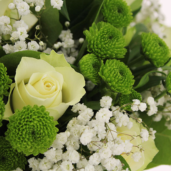 Bouquet rond dans les tons blanc et vert composé de roses, gypsophile, santinis et feuillages.