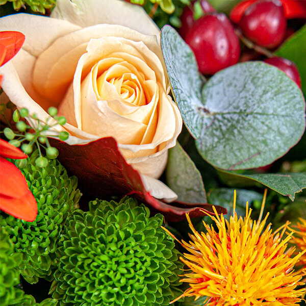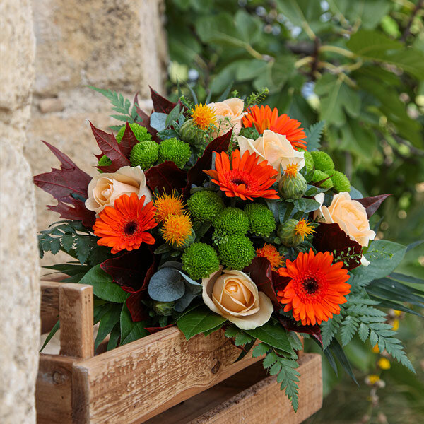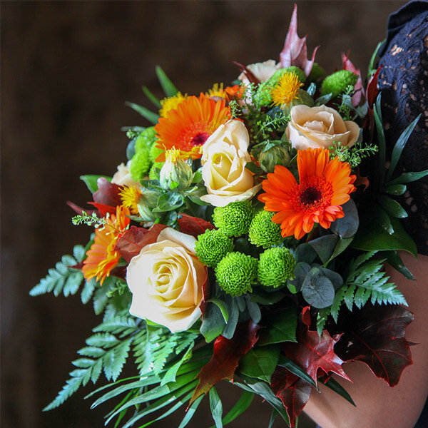 Bouquet d'automne dans les tons orange, saumon et vert composé de germinis, roses, santinis et autres fleurs de saison, le tout accompagné de feuillage.
