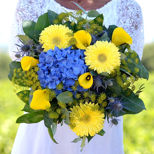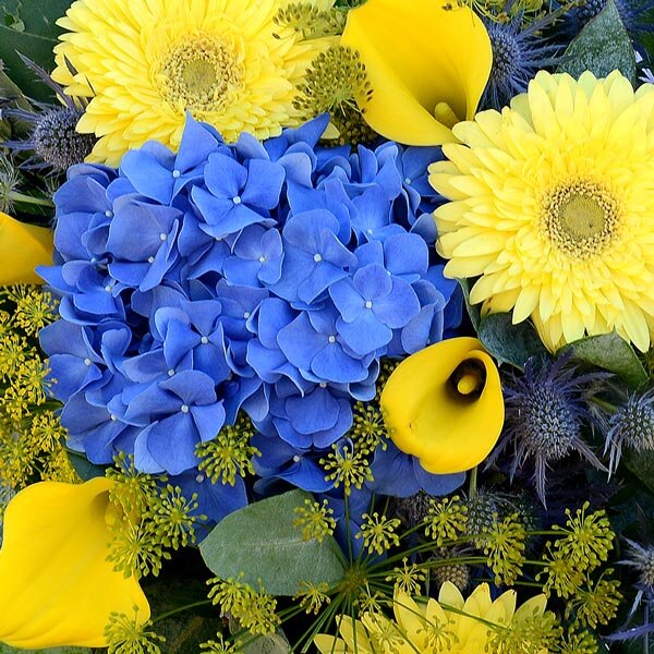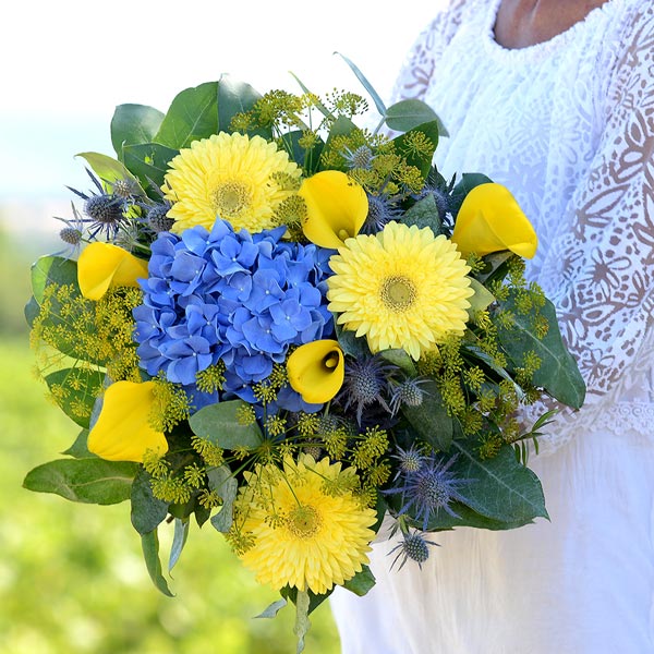 Bouquet dans les tons jaunes et bleus composé de callas, hortensias, gerberas et autres fleurs de saison le tout accompagné de feuillage.