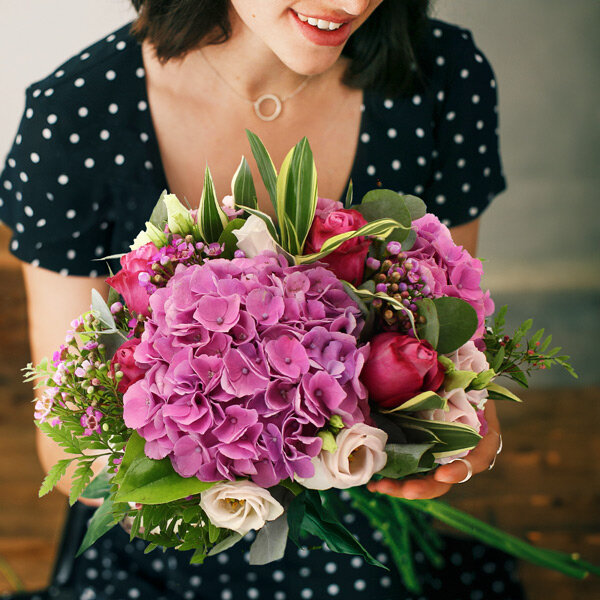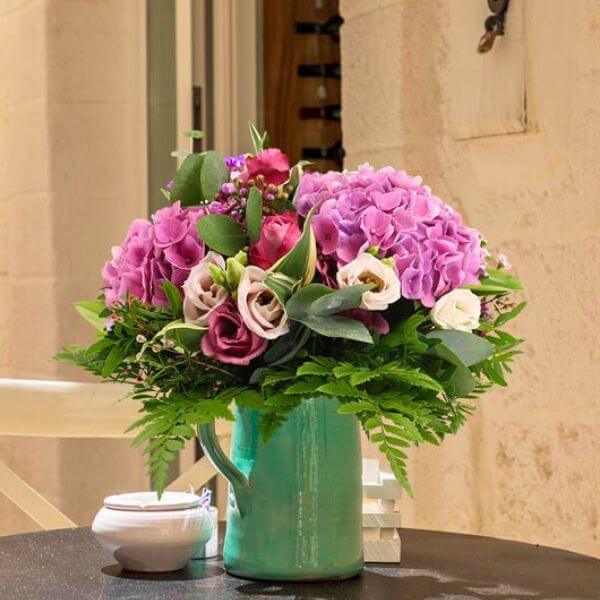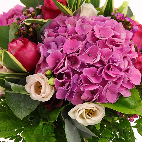 Bouquet estival dans les tons roses composé d'hortensias roses de roses fuchsias de lisianthus et autres fleurettes de saison et feuillage.