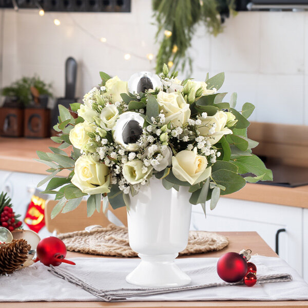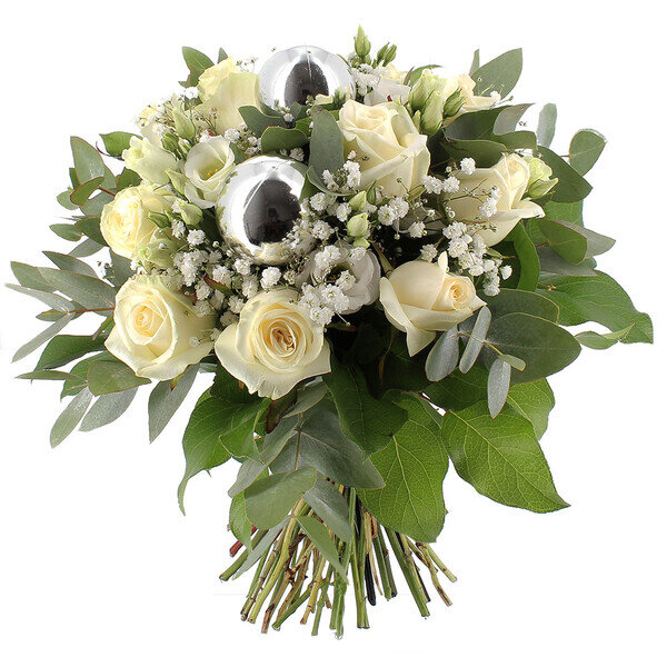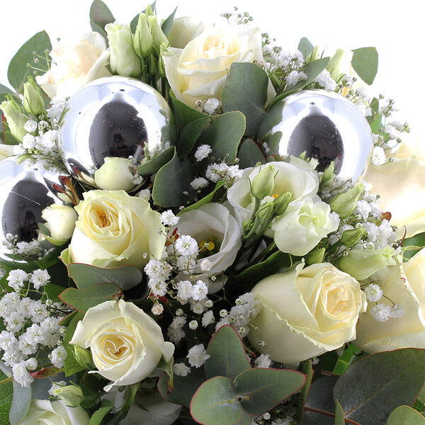 Bouquet dans les tons blancs composé de roses et boules de Noël, le tout accompagné de feuillage.