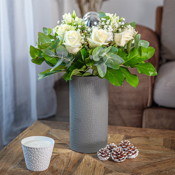 Toutes les couleurs de l'hiver déclinées en fleurs et en accessoires délicatement argentés sont assemblées dans cette fraîche composition que valorise grandement sa couronne de feuillage. Nos fleuristes ont composé ce bouquet en hommage aux grandes étendues gelées et aux matins frileux. Une composition coup de cœur qui ravira son destinataire.