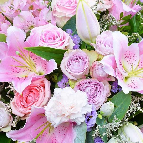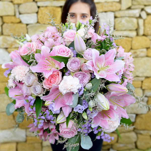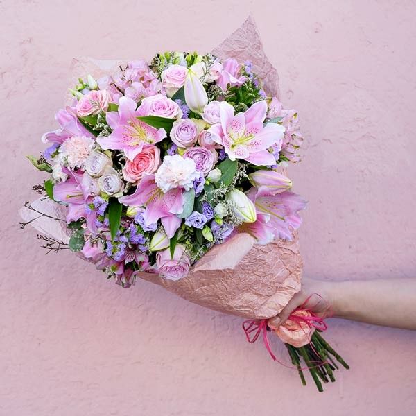 Bouquet dans les tons pastel composé de lys, roses, fleurs de saison et feuillage.