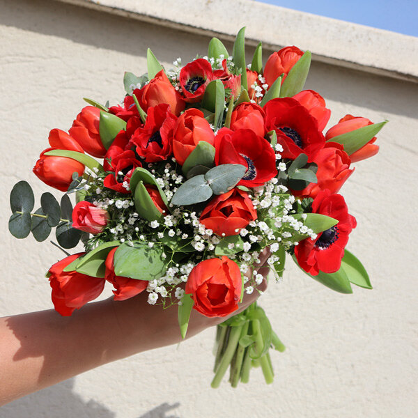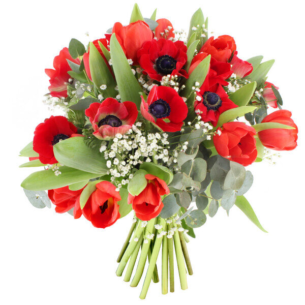Les tulipes et les anémones rouges forment ce duo qu'on attend chaque printemps. Leur rouge vif réveille la maison après l'hiver, amène cette énergie particulière des premières fleurs fraîches. Les tulipes se tiennent droites, presque sages. Les anémones ondulent légèrement, apportent du mouvement à l'ensemble.