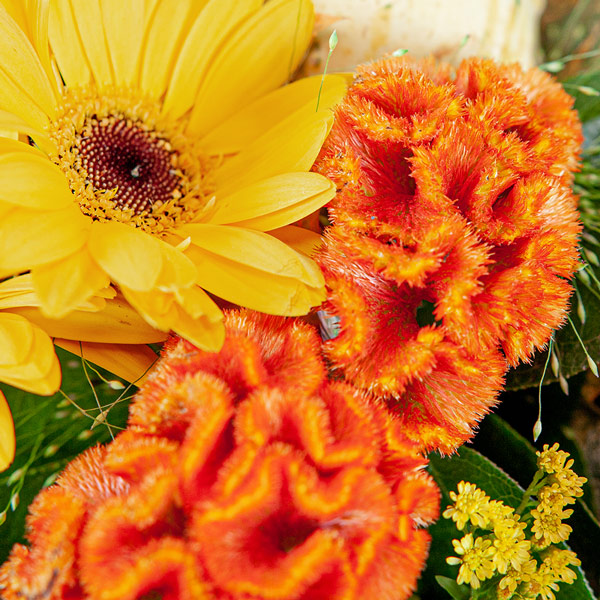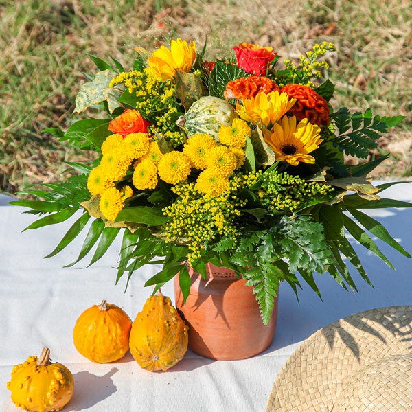 Bouquet d'automne dans les tons jaunes et orange composé de santinis, roses, germinis et autres fleurs de saison, le tout accompagné de feuillage.