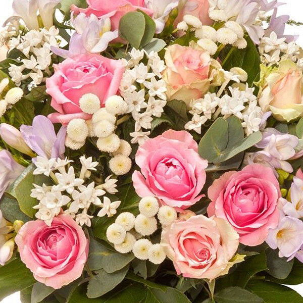Bouquet rond dans les tons rose pâle, parme et blanc composé de roses, freesias, matricaires et feuillages.