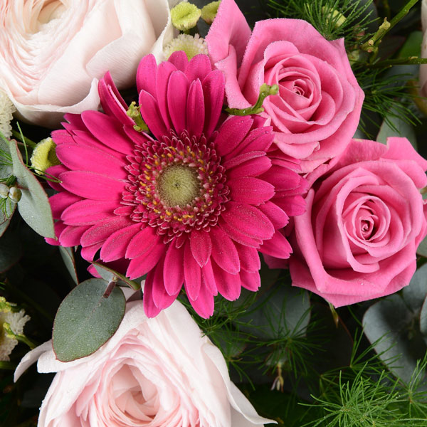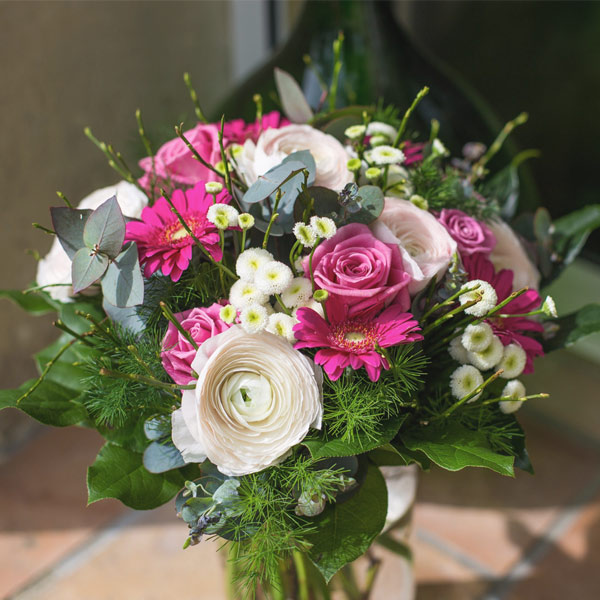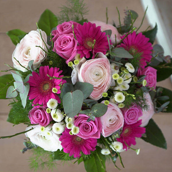 Bouquet dans un camaïeu de rose, composé de renoncules, matricaires, roses et germinis, accompagné de feuillage.
