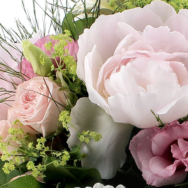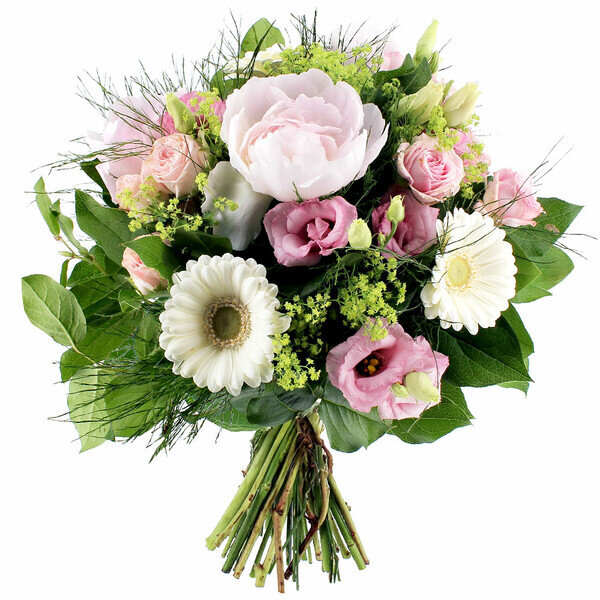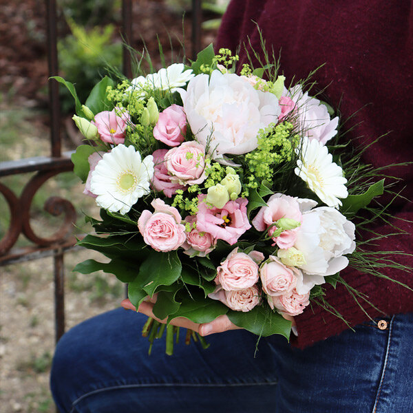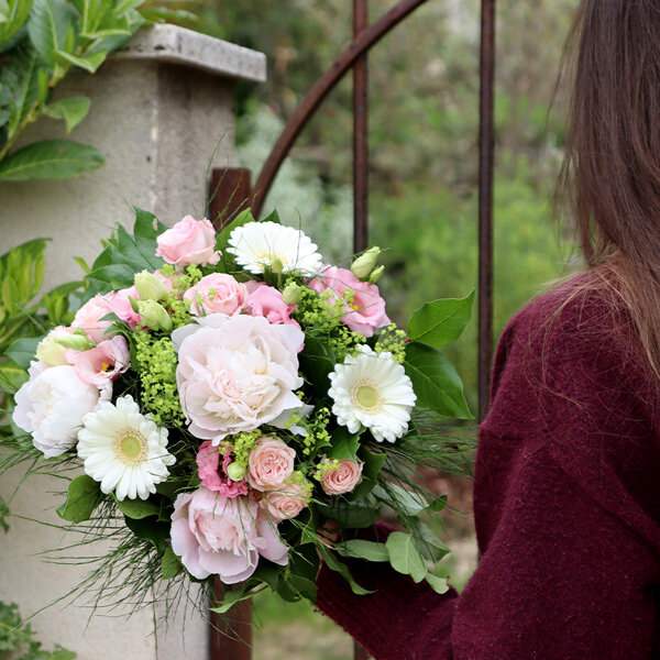 Bouquet dans les tons rose et blanc, composé de germinis, pivoines, lisianthus, roses grappes et de son feuillage.