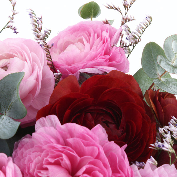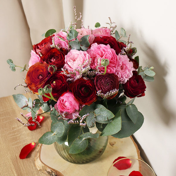 Un bouquet qui porte bien son nom, mélange de rouge intense et de rose doux. Les renoncules ont ces pétales fins qui font penser à du papier froissé, avec l'eucalyptus qui vient rafraîchir l'ensemble. Cette composition joue sur les contrastes : la profondeur du rouge bordeaux face à la légèreté du rose poudré.