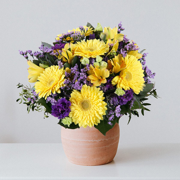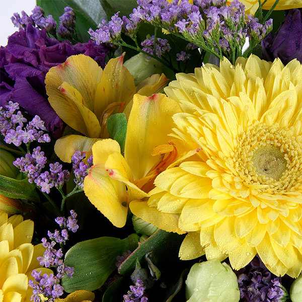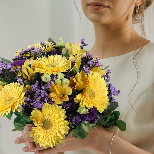 Des nuances de jaune et de violet pour venir illuminer votre journée et votre intérieur. Des gerberas à l'image de la générosité d'un soleil d'été, quelques touches nuancées de violet et de parme représentées par des lysianthus et des alstromérias le tout accompagné d'un feuillage structurant l'ensemble de cette magnifique brassée qui sent bon le Sud ! Un bouquet à offrir de février à septembre pour toutes les occasions; fête des grands-mères, fête des mères et bien plus encore !