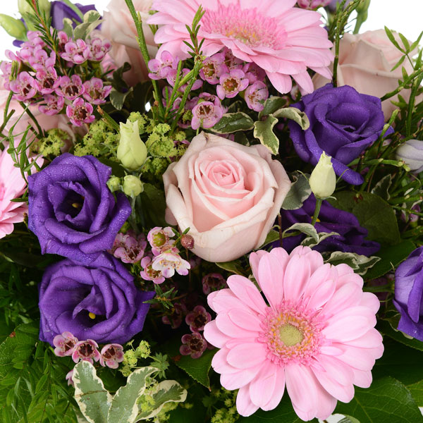 Bouquet dans les tons rose et violet composé de roses, germinis et autres fleurs de saison.