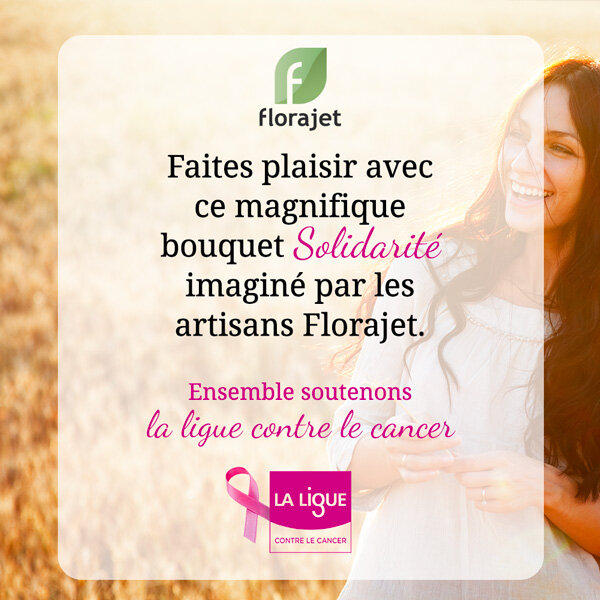 Florajet, spécialiste de la livraison florale, a le plaisir de s’associer de nouveau, à la Ligue contre le Cancer. Pour cette merveilleuse collaboration, Florajet a créé le Bouquet Solidarité, soigneusement conçu avec des fleurs sélectionnées pour leur symbolisme et leurs couleurs évoquant la bienveillance, la légèreté et l'affection. Un très beau message à véhiculer ! A partir de 39,90€, pour tout achat, 2€ seront reversés à la Ligue contre le Cancer. Ou comment faire une double bonne action ! Faites plaisir avec ce magnifique bouquet Solidarité et contribuez à soutenir une association qui lutte au quotidien pour aider au mieux les malades, leurs familles, imaginer et organiser des actions fortes ou de détente/cohésion, puis encadrer le dépistage de la maladie et la communication qui l'entoure.