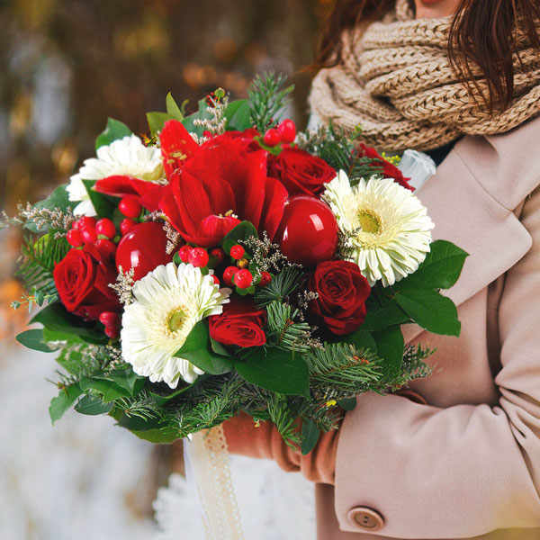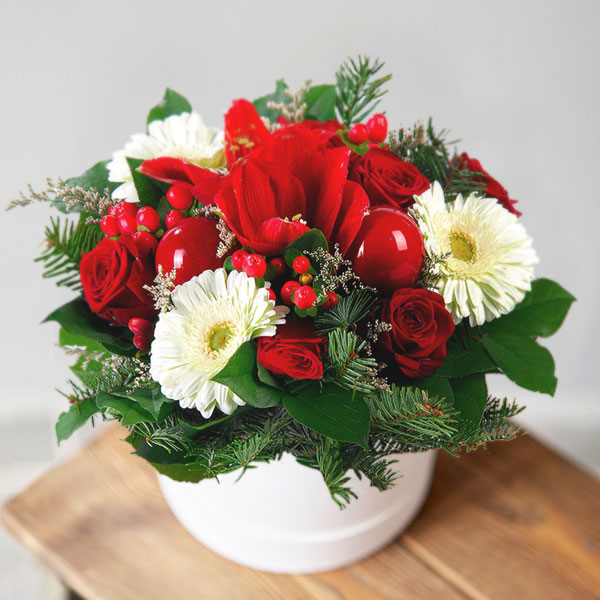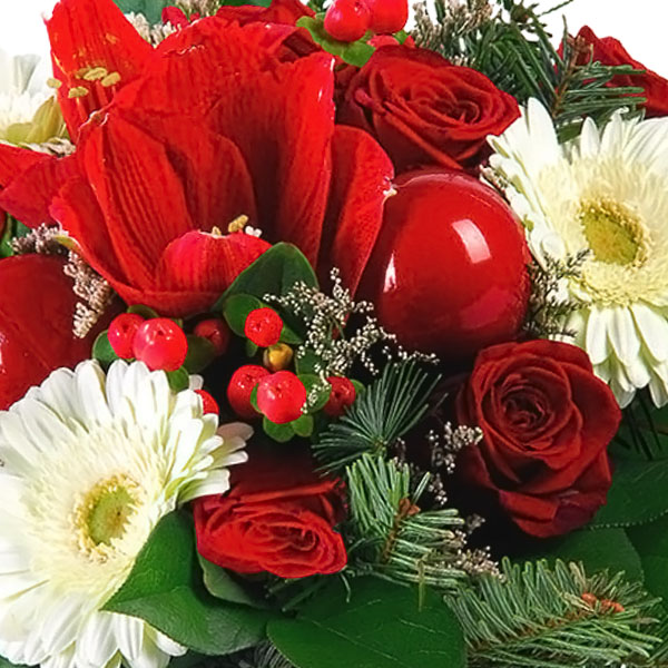 Bouquet rond de Noël dans les tons rouge, blanc et vert composé de germinis, roses, amaryllis et feuillages.