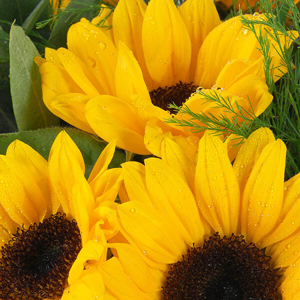 Bouquet dans les tons jaune et vert composé de tournesols et feuillages