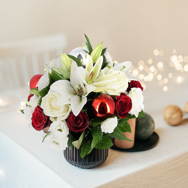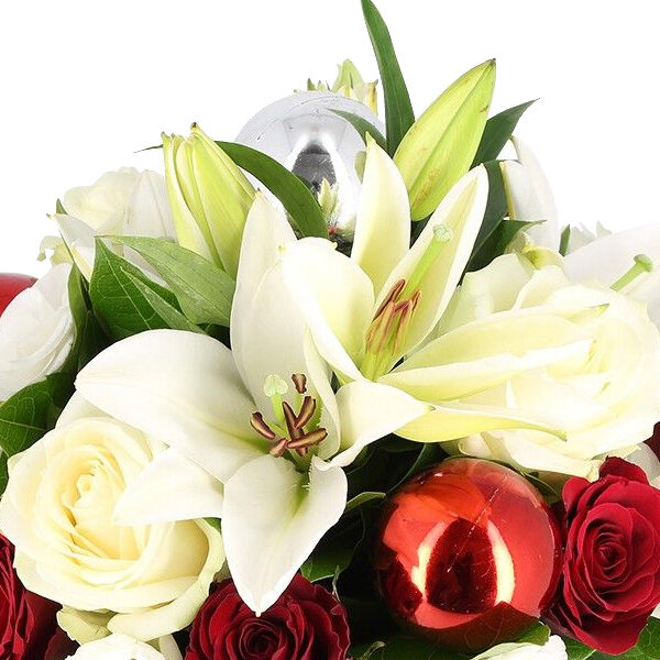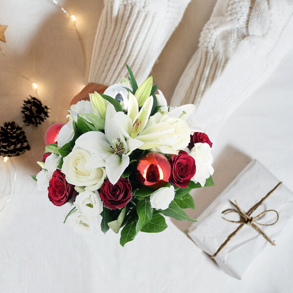 Bouquet rond de Noël dans les tons rouge et blanc composé de lys, roses, boules de Noël et feuillages.