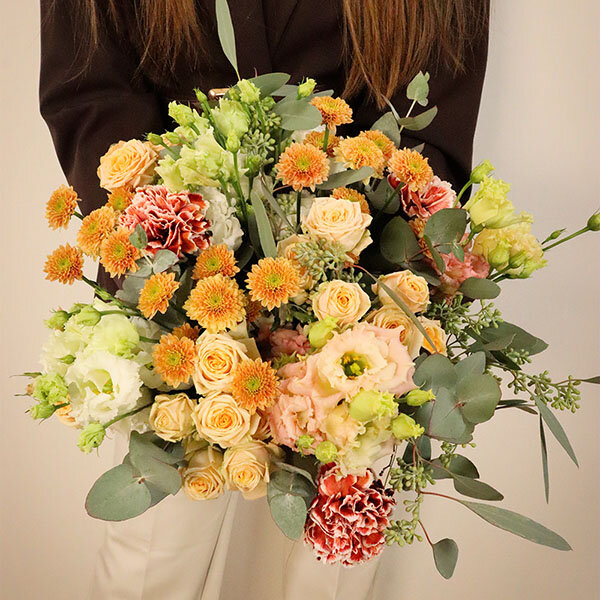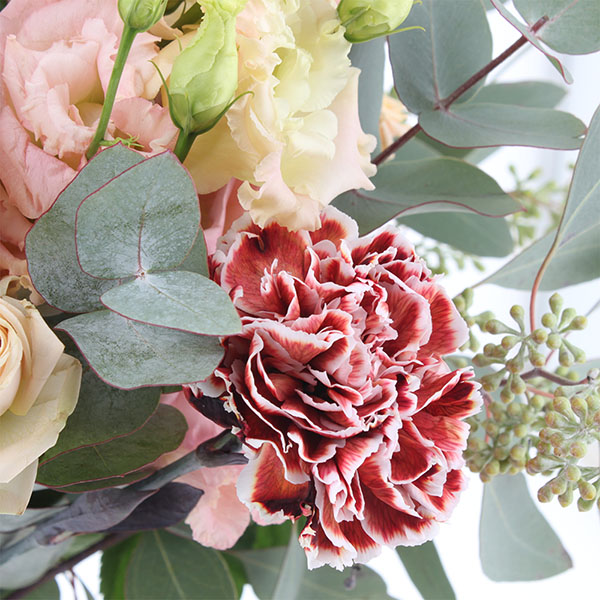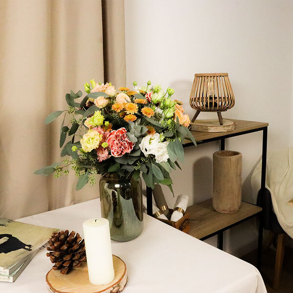 Terra Nova L s'affirme avec une présence immédiate. Impossible de passer à côté de ce bouquet généreux où les œillets aux pétales rebondis dialoguent avec des roses toutes en finesse. La rencontre du crème onctueux et du terracotta chaleureux crée une ambiance qui invite au repos et au bien-être.