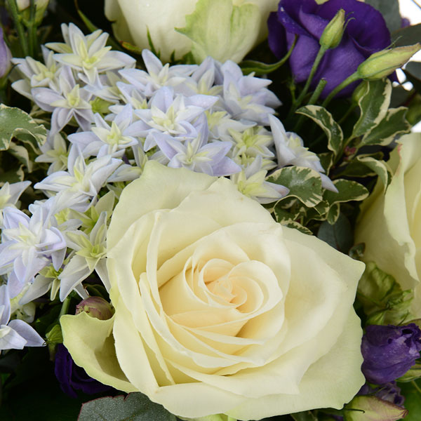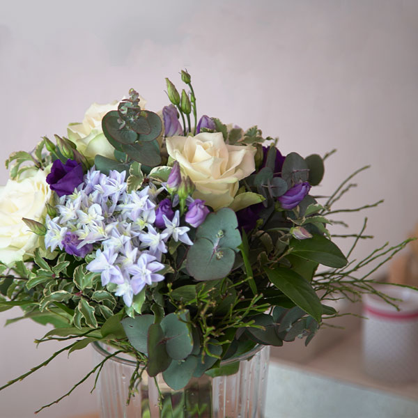 Bouquet dans les tons blanc et violet composé de roses, lisianthus et hortensias, accompagné de feuillage.
