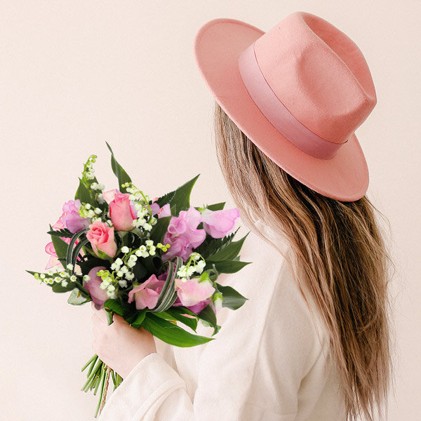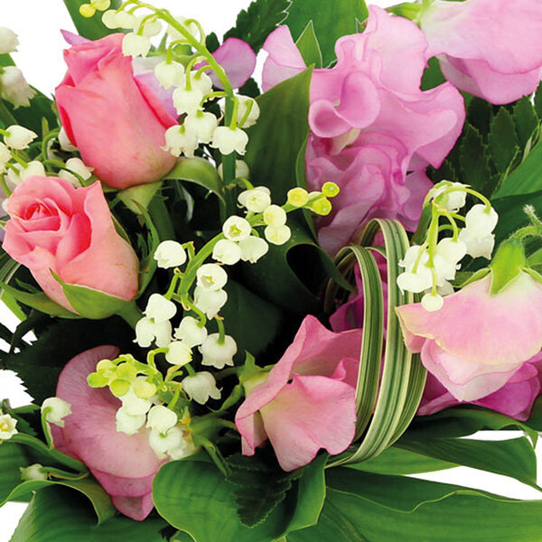 Bouquet dans les tons rose, blanc et vert composé de brins de muguet, roses roses, pois de senteur roses (peut varier en fonction des disponibilités) et feuillage.