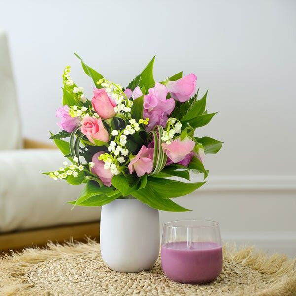 Nous avons adoré cette séduisante composition à l'allure romantique où les délicates roses s'allient à la finesse des pétales translucides parsemés des neigeuses petites cloches. Bouquet raffiné de muguet à offrir comme un bijou en cette fête du 1er mai.